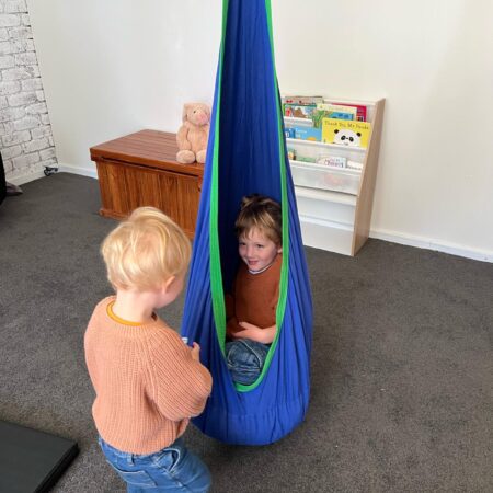 This cozy cocoon swing offers gentle vestibular input and calming motion for children seeking regulation, focus, or rest.
